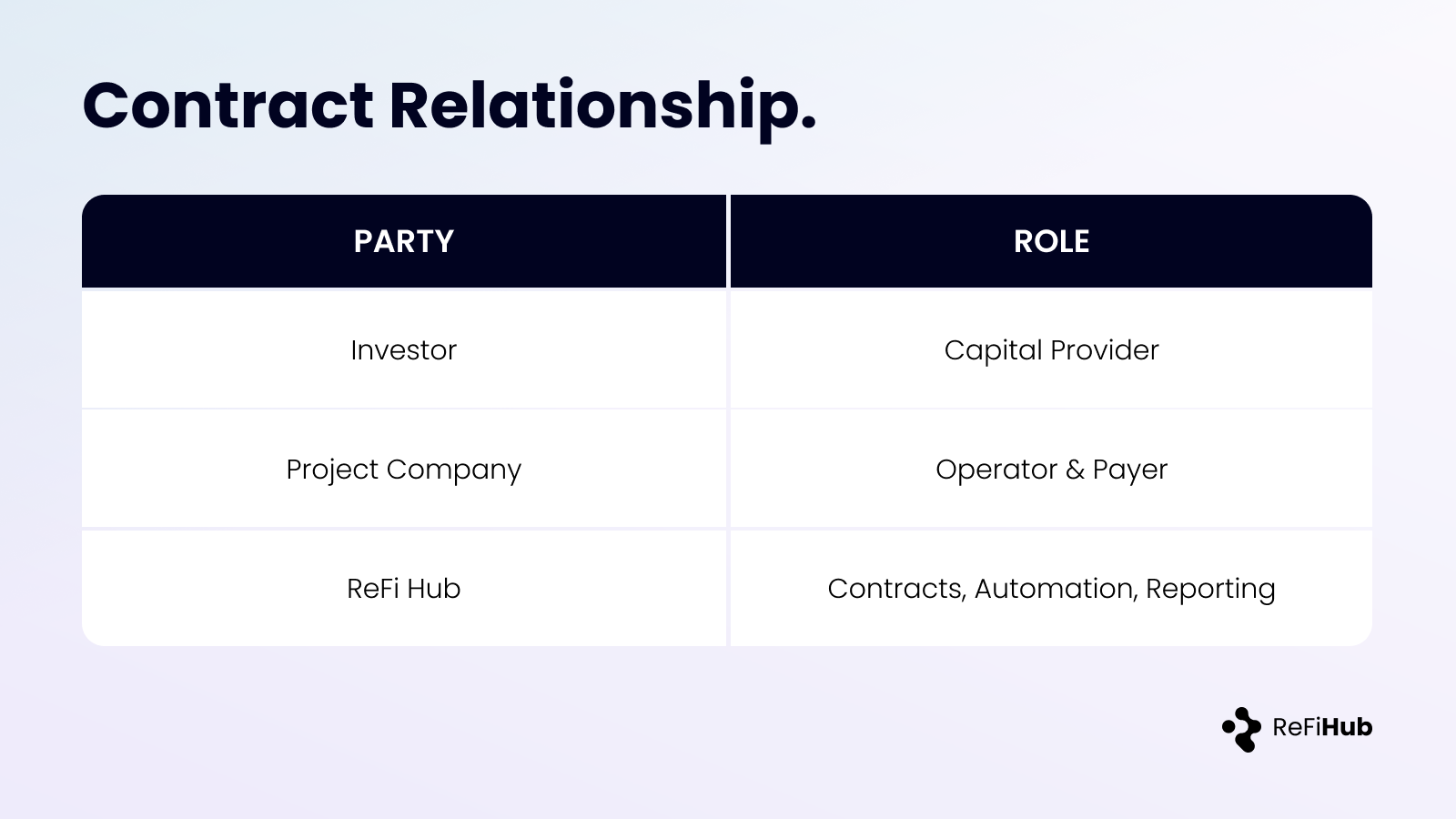 ReFi Hub does not custody funds, pool capital, or intermediate payments. It provides standardized contracts, automation, and reporting infrastructure.